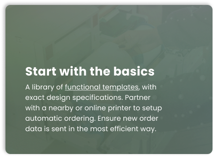 A library of functional templates, with exact design specifications. Partner with a nearby or online printer to setup automatic ordering. Ensure new order data is sent in the most efficient way.